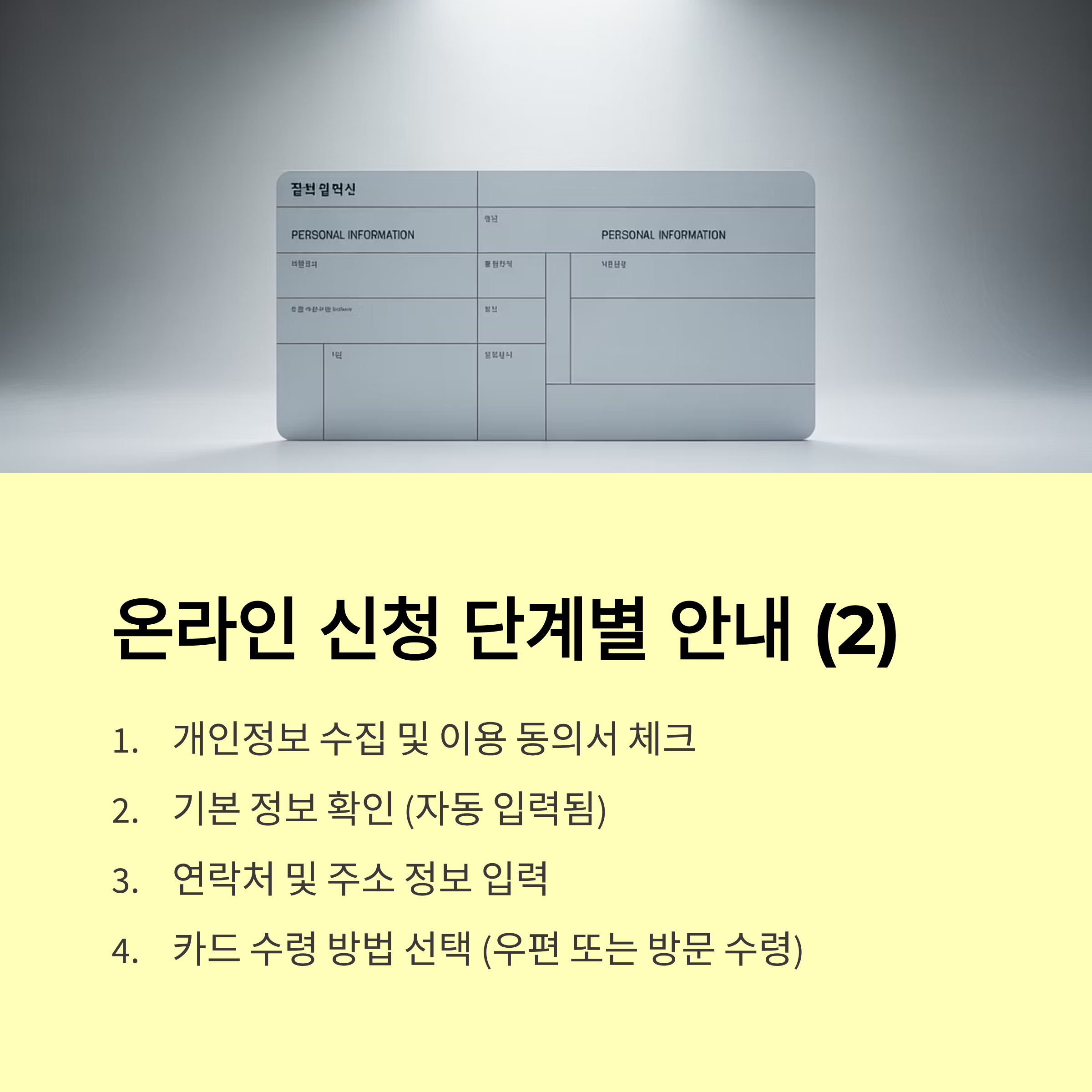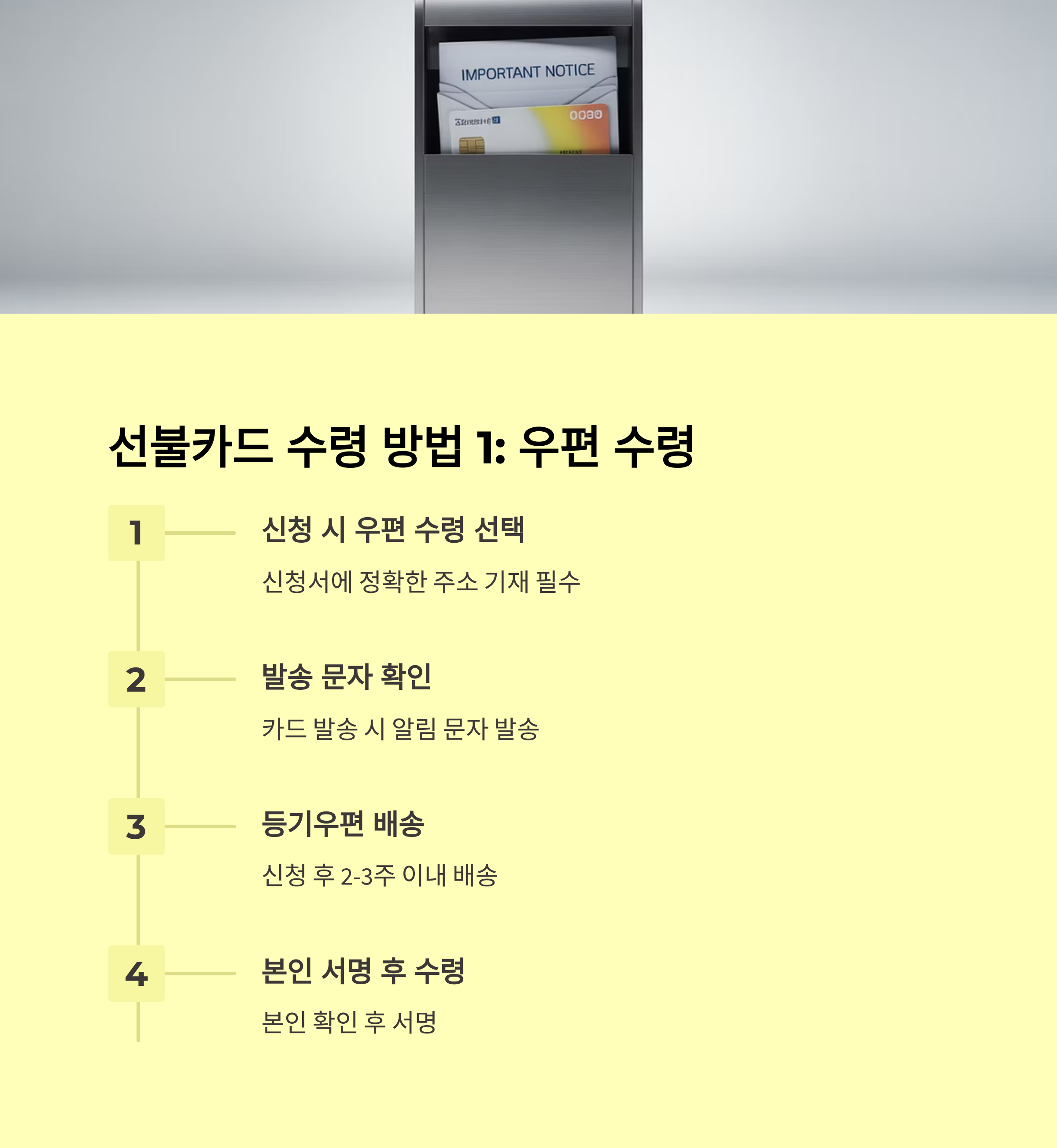 카드 수령 시에는 ‘본인 확인’이 필수이므로 꼭 본인이 직접 수령해야 해요. 대리수령이 필요한 경우 위임장과 대리인 신분증이 필요해요.