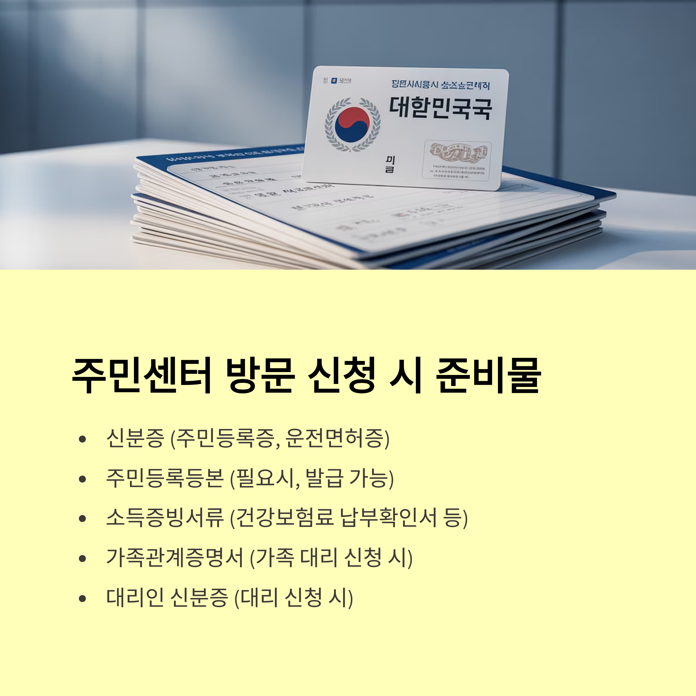 📌 오프라인 신청은 주민센터나 지정된 거점센터에 신분증을 가지고 방문해서 신청서 작성 후 접수하는 방식이에요.