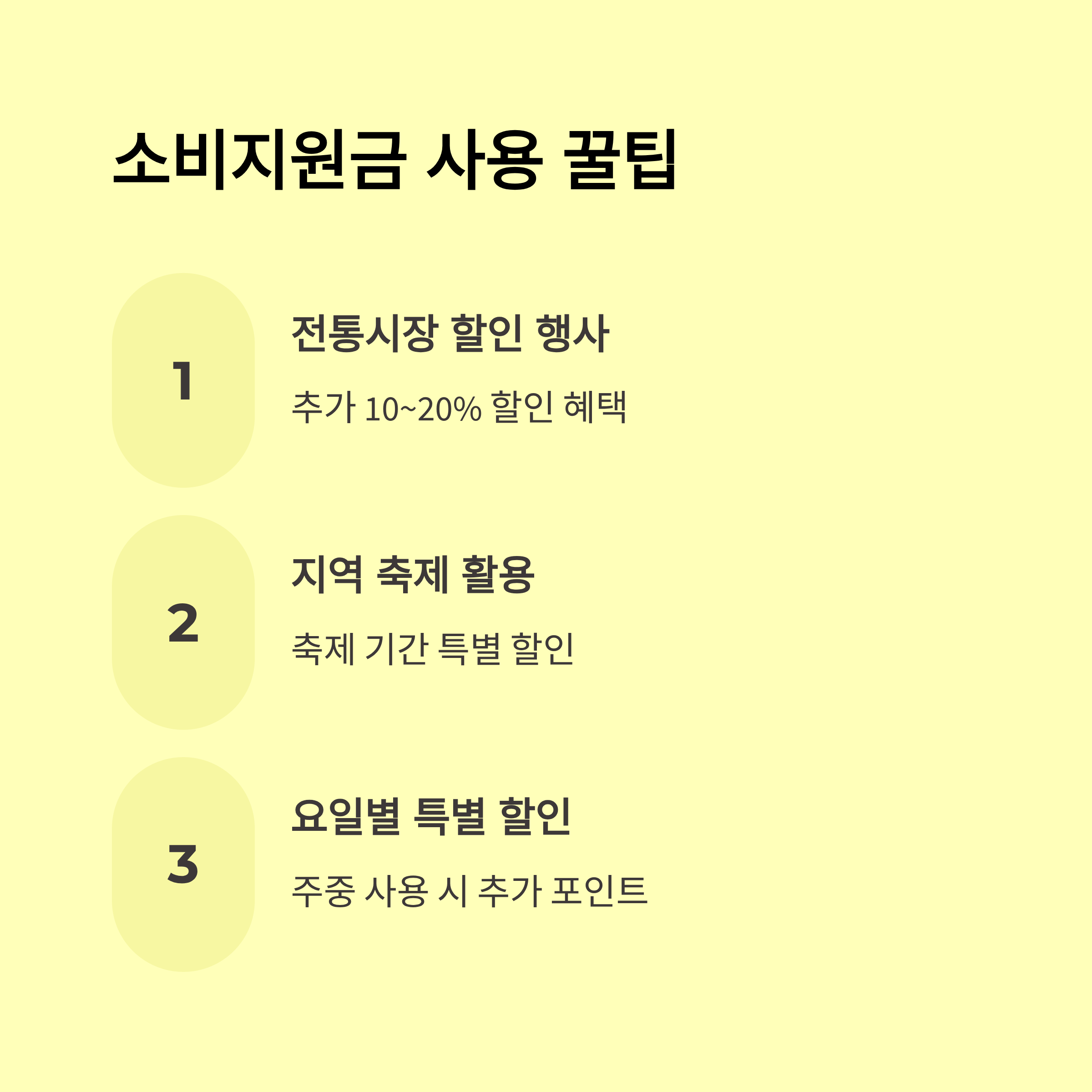 또한 일부 지자체는 지역문화페스티벌, 농산물 직거래 장터 등에서 소비지원금을 활용한 프로모션도 함께 진행하고 있으니, 지자체 홈페이지를 수시로 확인하는 것도 좋은 방법이에요.