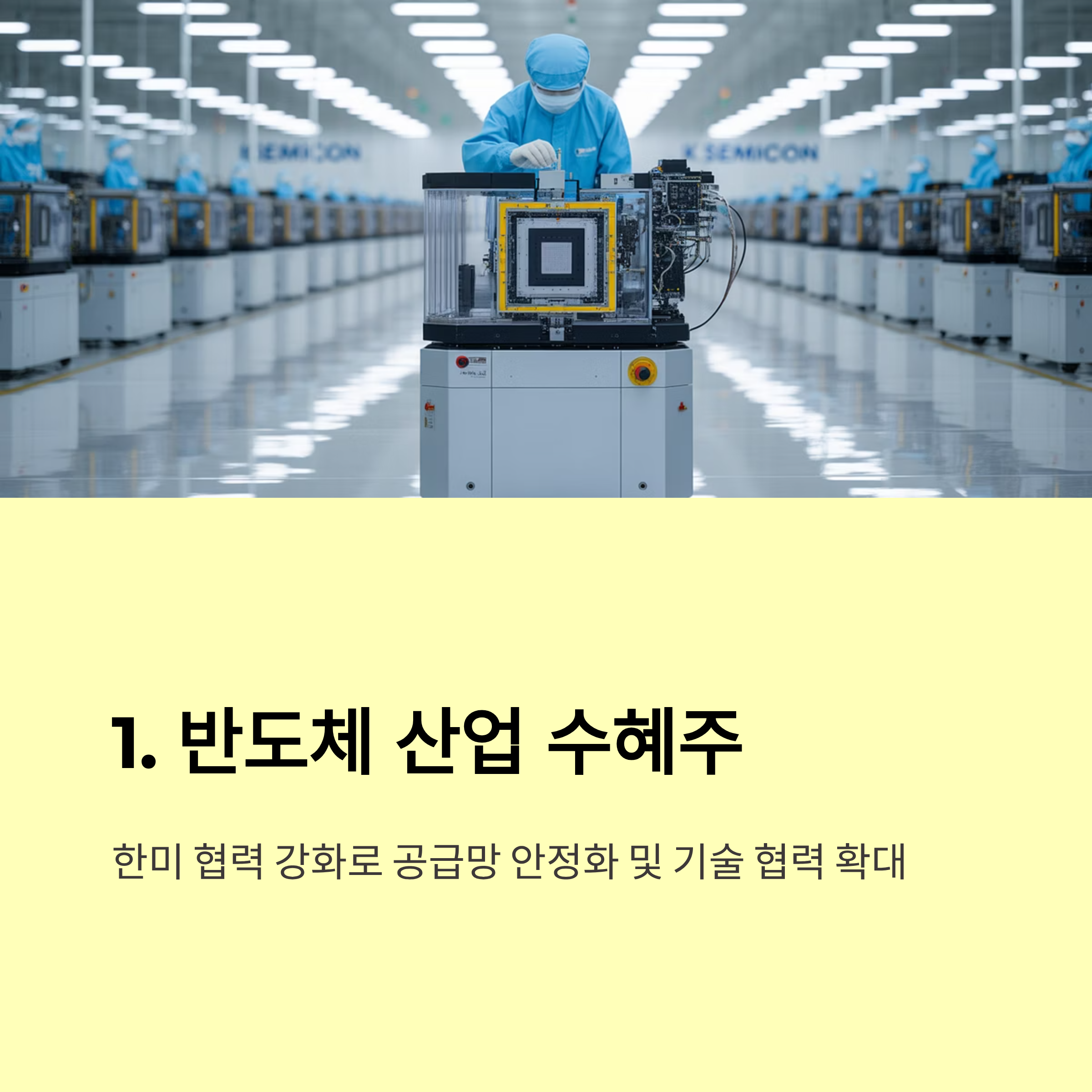 이번 한미 협상으로 직접적인 수혜가 기대되는 종목은 대체로 미국 내 생산기지를 확보하고 있거나, 보호된 국내 산업에 속한 기업들이에요. 특히 반도체, 2차전지, 스마트팜, 지도 데이터 분야는 주목할 만해요.