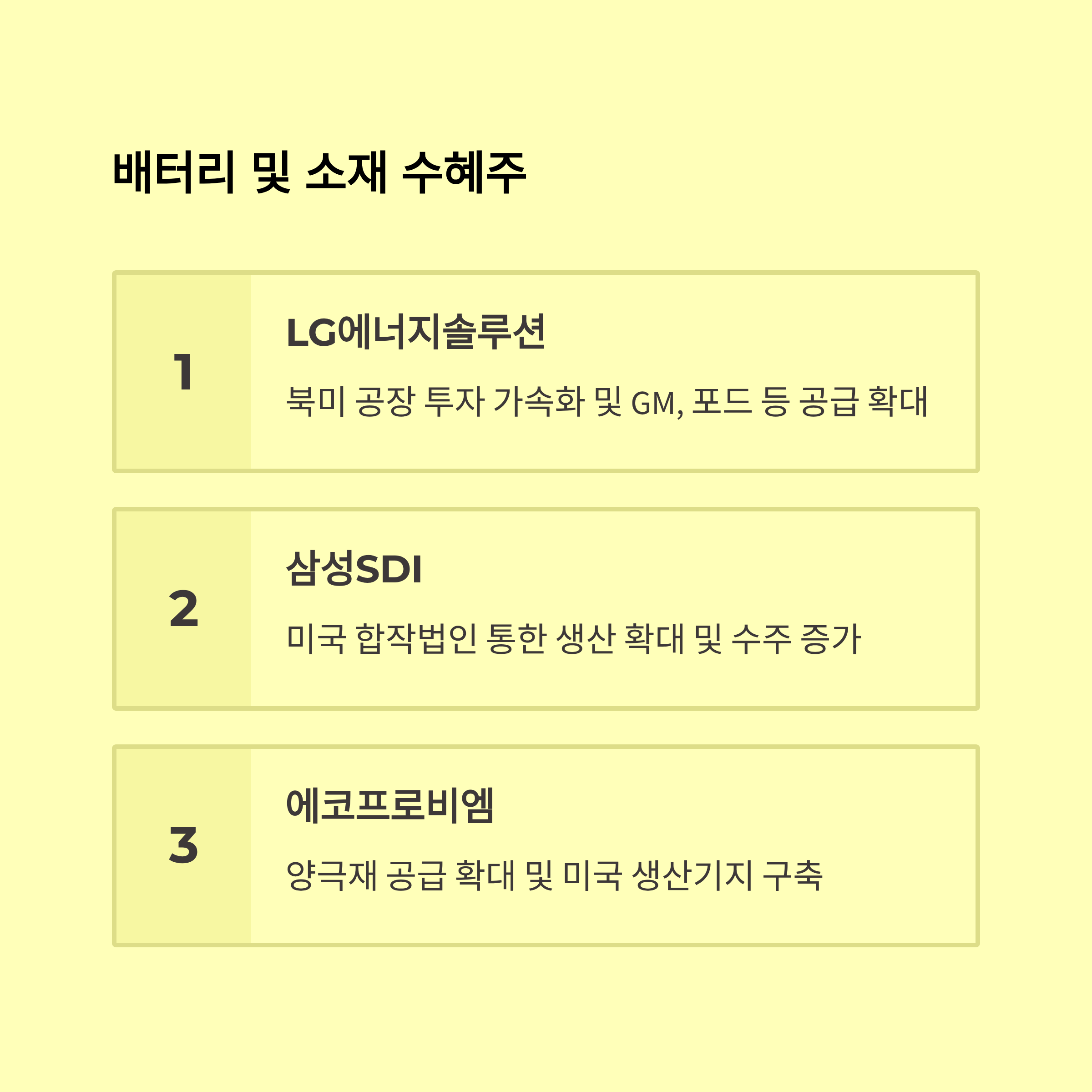 | 자동차 | 현지 생산 확대, IRA 수혜 | 미국 내 브랜드 경쟁 심화 |