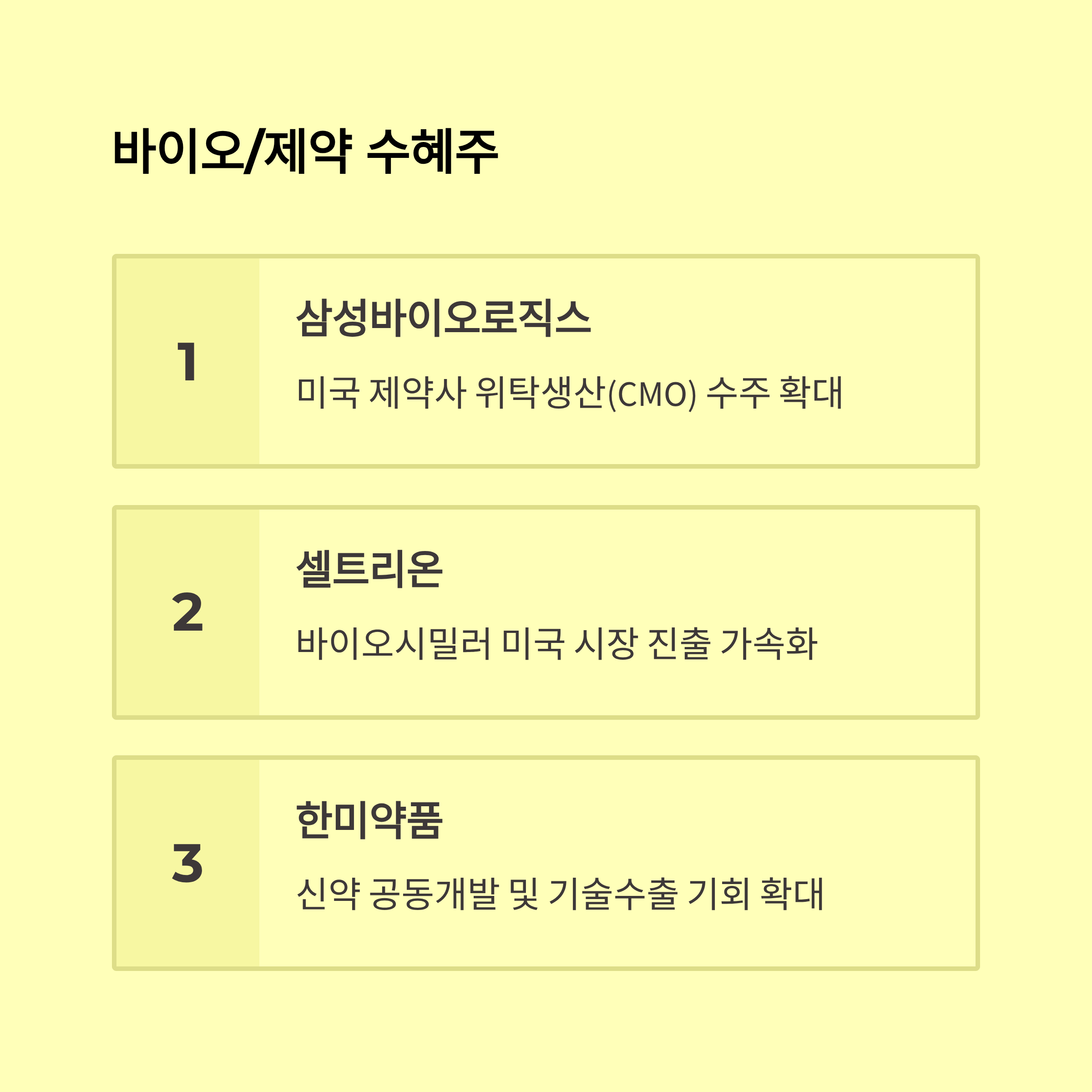 | 종목명 | 분야 | 수혜 요인 |